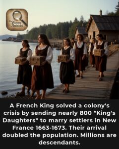 To address this, between 1663 and 1673, approximately 768 to 800 young women, known as the “Filles du Roi” or “King’s Daughters,” were recruited for this purpose.
